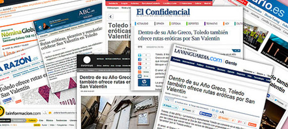 En numerosas ocasiones "Rutas de Toledo" ha sido reseñada en medios de prensa nacionales y también internacionales. Nuestras rutas aparecen en Agencia EFE, Euronews, 20minutos, El Confidencial, ABC Toledo, La Vanguardia, La Razón, EnCastillaLaMancha.es, El Diario, TVE (España Directo), Cuarto Milenio... Son cientos los reportajes en los que hemos aparecido, las rutas más famosas de la ciudad. Lea más aquí.